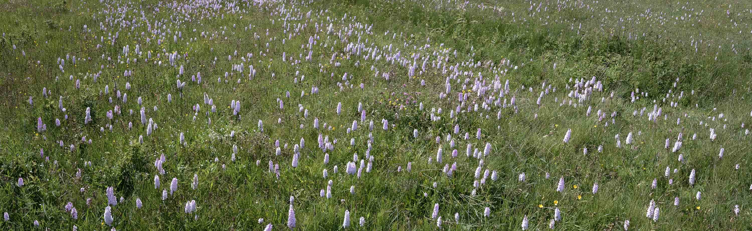 Ett fält med orkiden Persnycklar på Veddö naturreservat i Bohuslän
