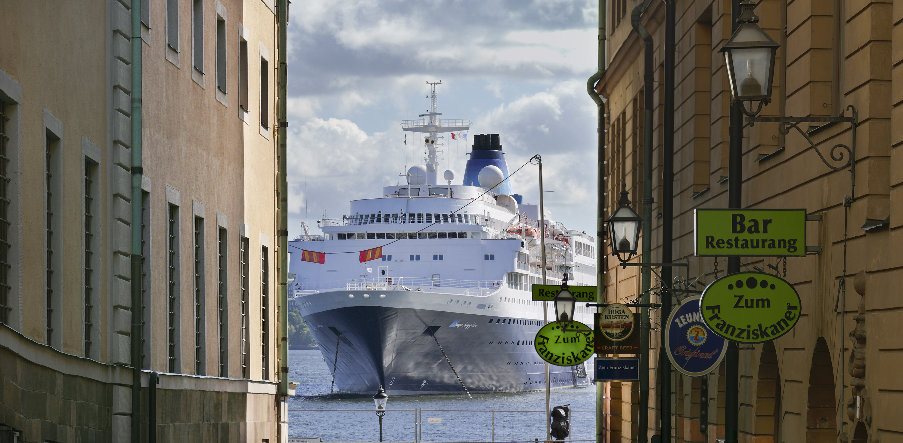 Ett fartyg syns genomn gränd i Gama stan